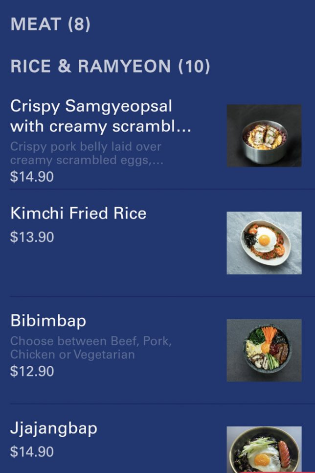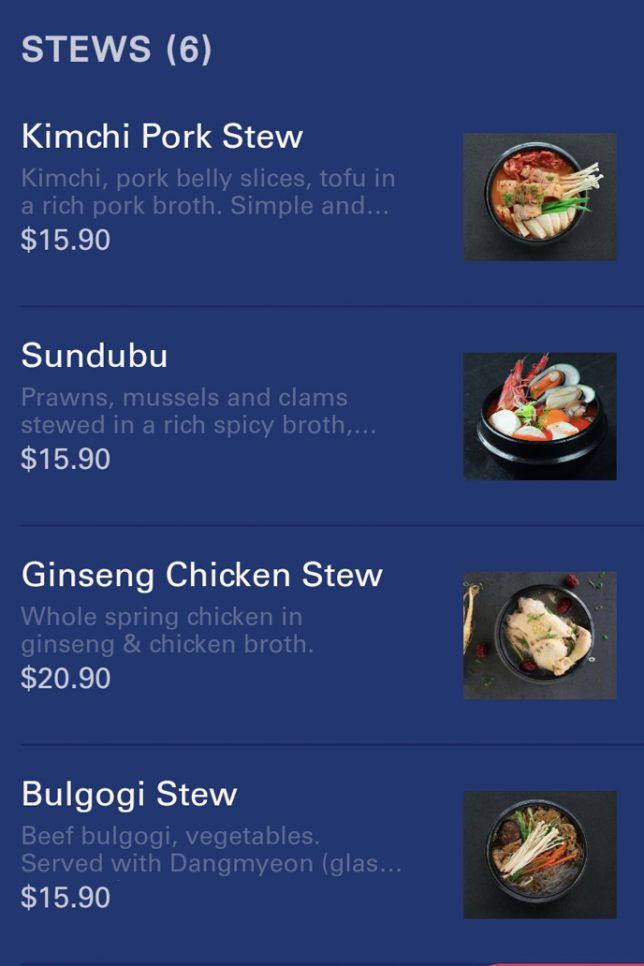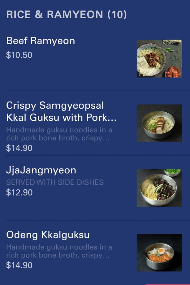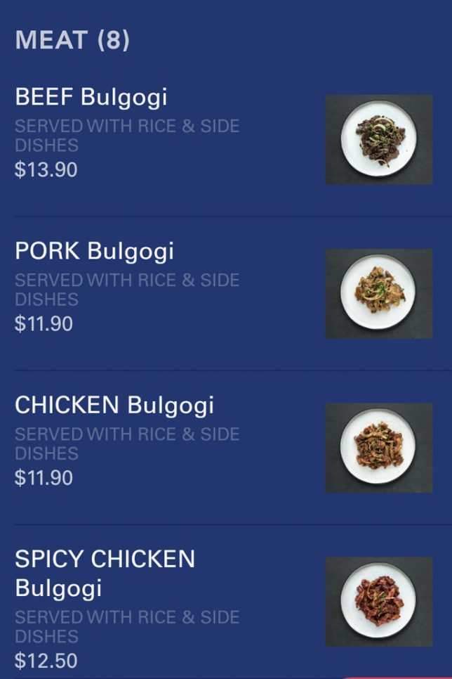 The menu of Ajumma’s is on its website. Below are a few screenshots of the digital menu of the food-ordering phone app