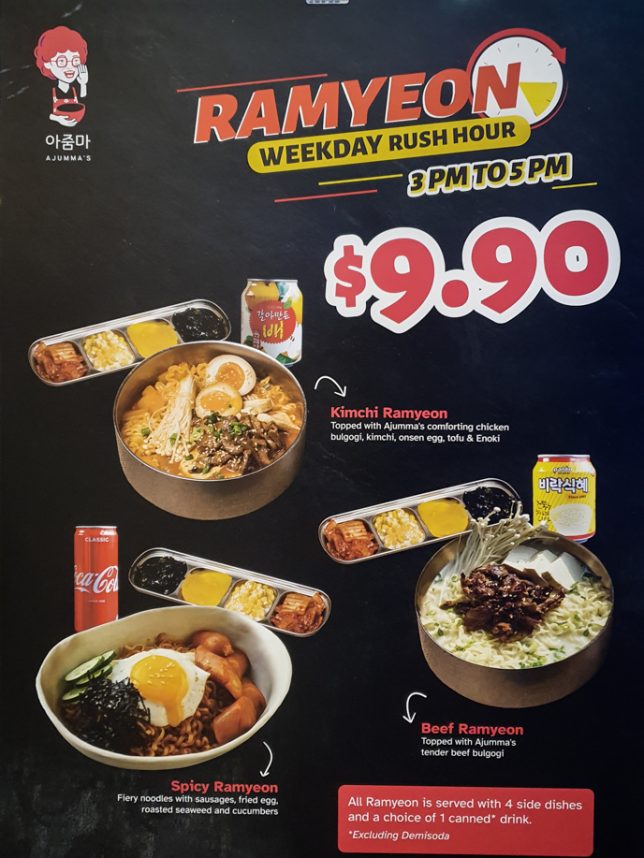 Currently, Ajumma’s at PLQ Mall has a teatime promotion. Between 3 pm and 5 pm on a weekday, a Ramyeon meal with side dishes and a drink is priced at only $9.90.