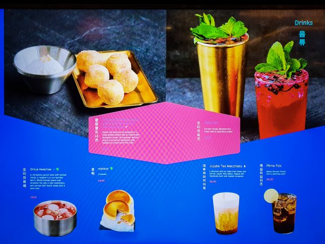 The interior decorations and furniture at Ajumma’s are basic. However, bold and bright colors and lighting help to create a lively and energetic atmosphere that feel vibrant and trendy.