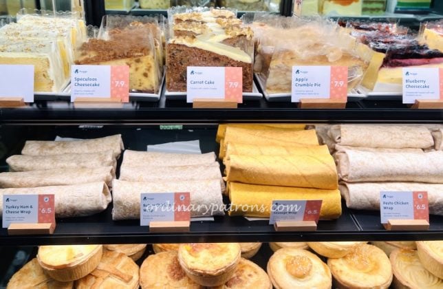 The food choices on display are the usual suspects – different types of wraps, pies and cakes.