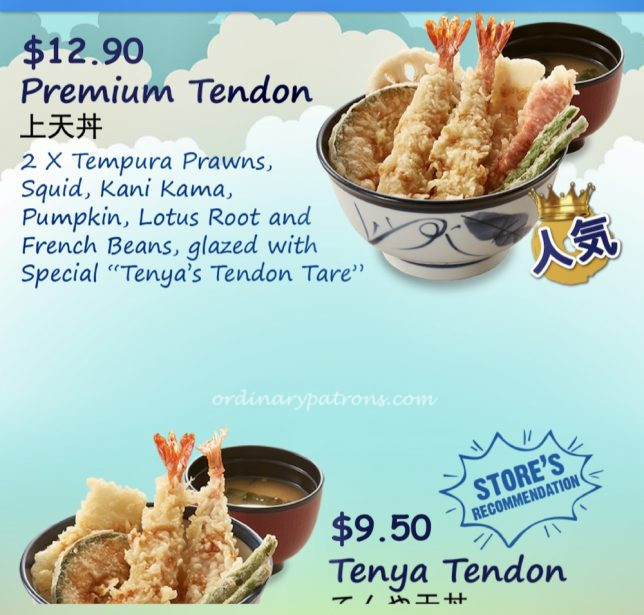 The Tenya restaurant contains mainly different variants of tendon (i.e. rice bowls with tempura toppings) and several side dishes. Those with a big appetite can opt for a set meal which is an add-on of an extra serving of soba or udon. Here are pictures of some portions of the Tenya Tempura ION Orchard Menu. At Tenya, they offer an option to increase or reduce the quantity of rice in the tendon. The prices shown on the menu are for a regular serving. A 50 cent discount or surcharge is applied if the rice is reduced or increased respectively. We think that this is a very good idea that reduces food wastage.