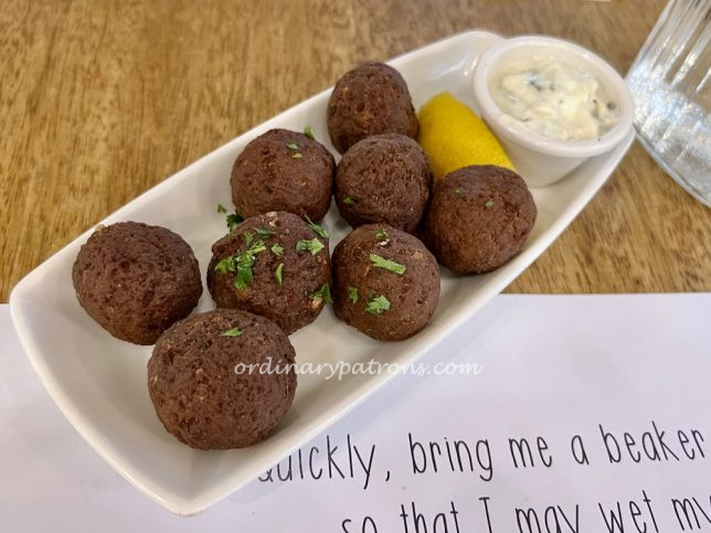 Our other Greek appetiser, meatballs with mint and lemon ($18.90), was more substantial. This would be a good finger food to eat with some cold beer.
