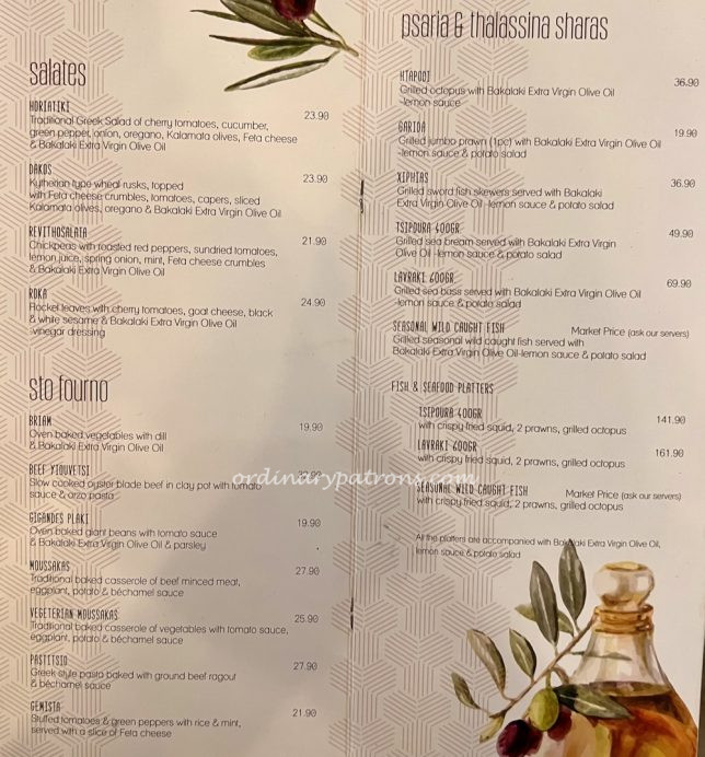 The new Bakalaki Greek Taverna’s location used to be the space which housed the PS Cafe Martin Road outlet. But they have transformed it beyond recognition. Perhaps they have taken more space, but this new Greek restaurant at Martin Road is very spacious. There are different pockets of space with different personalities. The nicest area is the front side fronting Martin Road (picture below). With very high glass windows letting in lots of natural light, this place feels modern and airy.