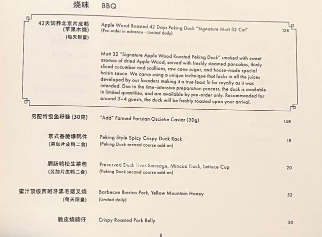 The highlights of Mott 32 are the roast meat dishes. In particular the BBQ Iberico pork with yellow mountain honey ($52) and the Apple wood roasted 42 days Peking Duck ($128). Soon after our reservation was made, we received a call from the restaurant. The roast pork (char siew) would be available but not the Peking Duck.