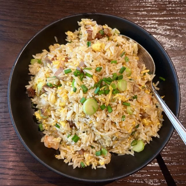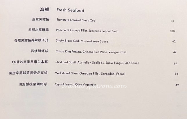 Although disappointing, unavailability of the Peking duck provided a silver lining – we could try more new items from the menu. We selected the King Prawn, Black Pepper ($42), Garlic, Soya Sauce Signature Smoked Black Cod ($58) and Fried Rice, Diced Prawn, Iberico Pork, Asparagus in Yeung Chow Style ($32).