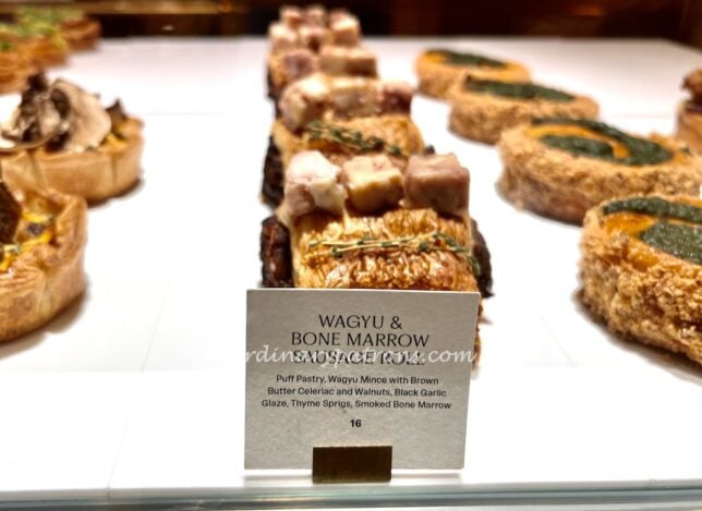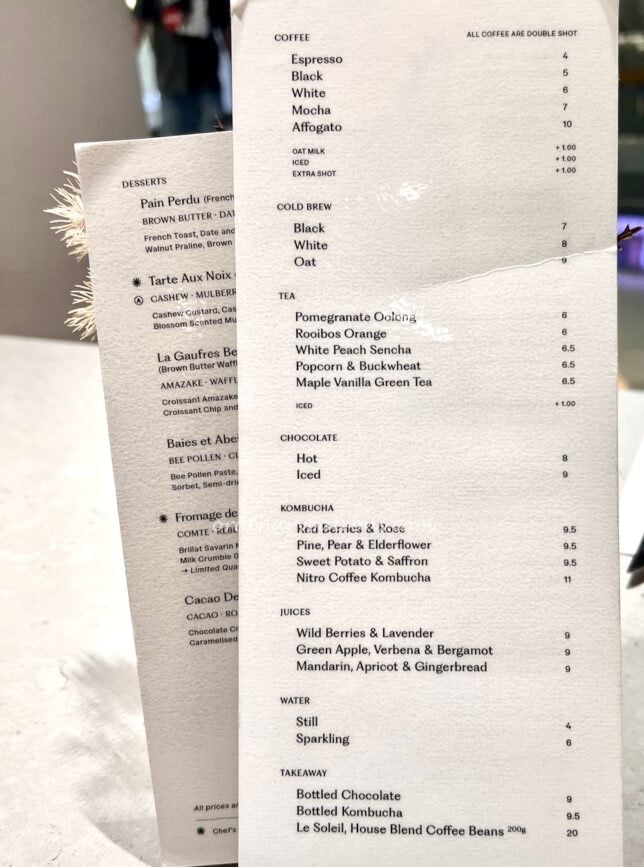 There are currently 3 menus in the Le Matin Patisserie. The ALL DAY menu contains small patisserie items like cakes, tarts and pastries (both sweet and savoury). BRUNCH menu is served from 1100 – 1430 Wed to Sun. This contains more substantial items such as the Wagyu Brioche Feuilletรฉe ($48) and Seafood Pot Pie ($25). DESSERT menu is available on Wed to Sun at 1800 – 2100. Here are pictures of some portions of the menu. A full set of the menus are available on the website, the link of which is provided at the end of this post.
