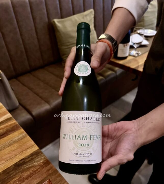 Elan restaurant has a “one for one” corkage policy. This time we came prepared. We purchased a bottle of white wine from the restaurant – 2019 William Fรจvre Petit Chablis. According to a quick internet search, normal Chablis has greater complexity, and therefore aging potential. Petit Chablis is said to be lighter, and is expected to be enjoyed young. A light refreshing wine is always a good companion for lunch in hot tropical Singapore.