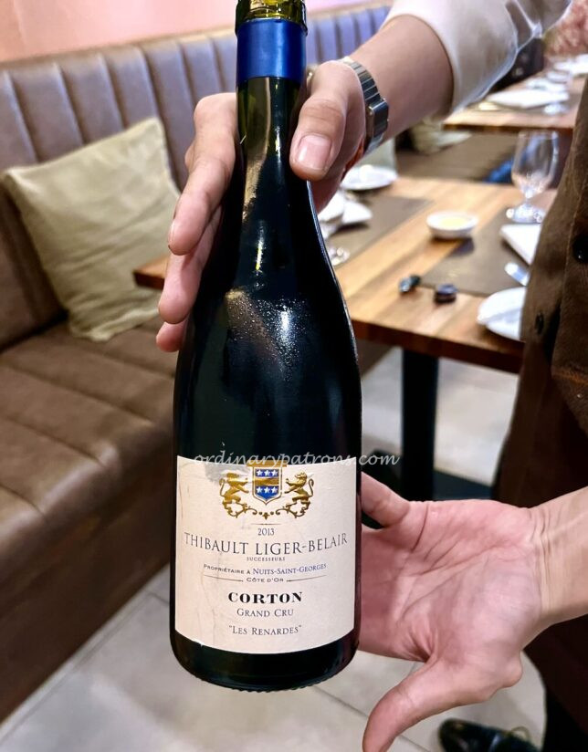 The wine we brought from home was a 2013 Thibault Liger Corton “Les Renardes” Grand Cru. According to the wine maker’s website, 1004 bottles of this red Burgundy were produced and this is a description of it: “…This wine has a great depth and it is necessary to tame it to sense it perfectly… This appellation is well known as Renardes, because its wines are always very rich with animal, leather and black fruit notes.” We ordered the quail partly because of this wine. They complemented each other perfectly.