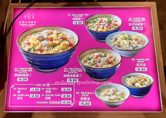 Famous Eunos BCM currently has 3 locations in Singapore. Apart from the Eunos Crescent location that is being renovated, the other two in operation are at Blk 106 Hougang Ave 1and ION Orchard Basement 4 Hawkers’ Street. Here is a picture of the Eunos BCM menu. We decided to try the Signature Bak Chor Mee in both soup and dry formats ($6 each).