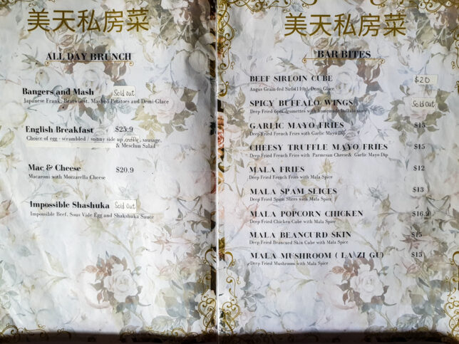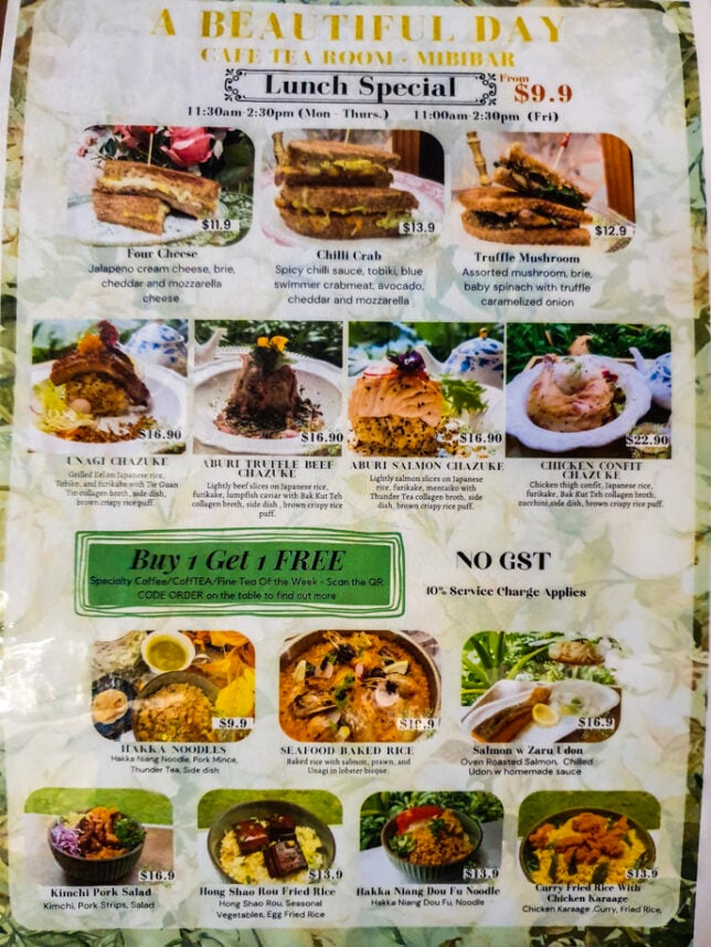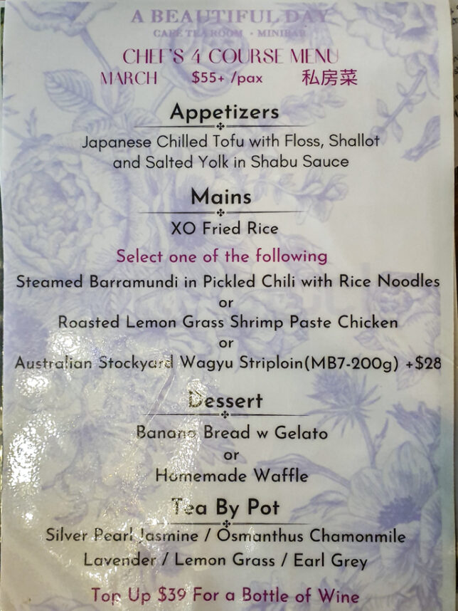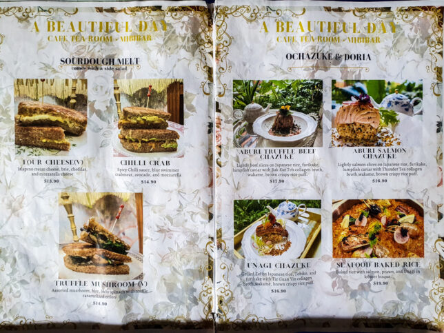 You will be surprised if you are expecting English tearoom fare like delicate finger sandwiches, scones and Earl Gray tea on the menu of A Beautiful Day at PLQ Parkside. The menu does have English Breakfast and fine English teas but a large portion of the menu is taken up by items that would never have been on a dining table in Victorian England. The menu is more like a potluck list for a multi-cultural dinner in Singapore – Japanese Ochazuke, Mala Popcorn Chicken, Kimchi Pork Salad and Hakka Niang Dou Fu are some of the dishes on the menu.