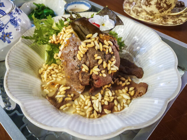 Chazuke or ochazuke is a Japanese dish made by pouring green tea, dashi, or hot water over cooked rice. At A Beautiful Day, the Aburi Truffle Chazuke was presented on an English afternoon tea tray complete with a bone China English teapot for the chazuke broth. Thin slices of beef were neatly arranged over a plate of rice.