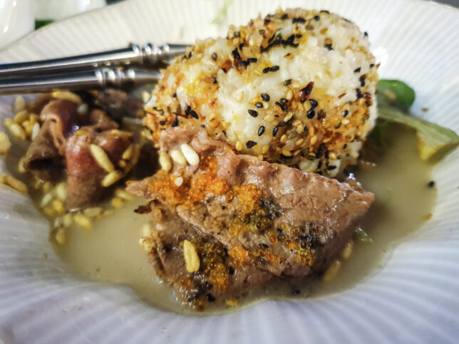 It was an enjoyable dish. The beef was tender. The broth was not Japanese tea or dashi but bak kut teh with collagen. It was rich and tasty. All the ingredients, which included lump-fish caviar, wakame and crispy rice puffs, combined well to produce layers of different flavours.