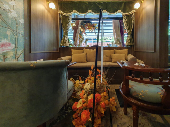 The interior is designed to evoke a Victorian era country house vibe. There are floral wallpaper, vintage lace curtains, dark wood furniture and plush upholstered sofas and settees.