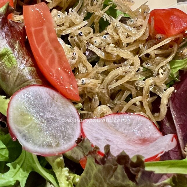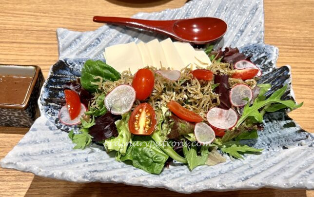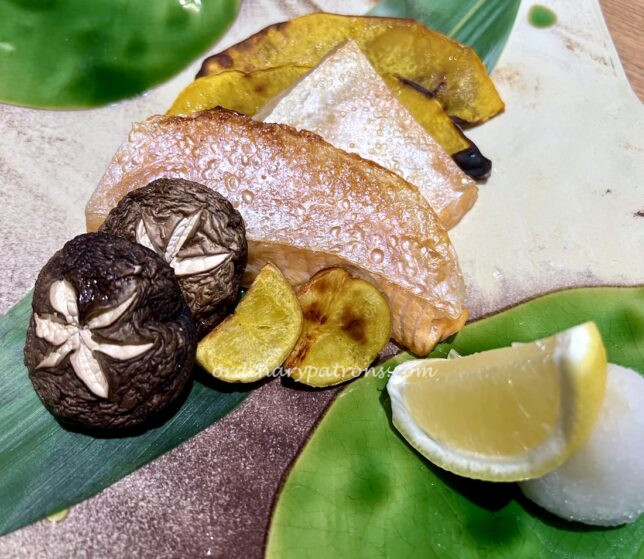 Grilled salmon belly was oily and rich in taste. A few slices of vegetable tempura completed the dish.