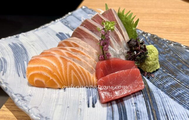Based on our lunch experience, we had expected a modest sashimi platter. But this was not the case. The sashimi platter of three types of fish was served in large thick slices. The salmon was quite ordinary but we enjoyed the lush taste of the yellow tail and the tuna.