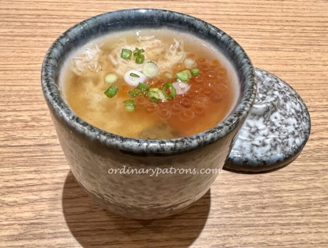 The Tottori crab chawanmushi was the best item of the day. This was the first time I have heard of Tottori and so needed the help of the internet to find out what it is. According to Wikipedia, Tottori Prefecture is theย least populous prefectureย of Japan. It is famous for its sand dunes and that may explain why it has such good crabs. The shredded bits of crab in the chawanmushi made it a special dish for us. Very fine and delicate. We would love to try the Tottori crab dishes on the a la carte menu on a next visit.