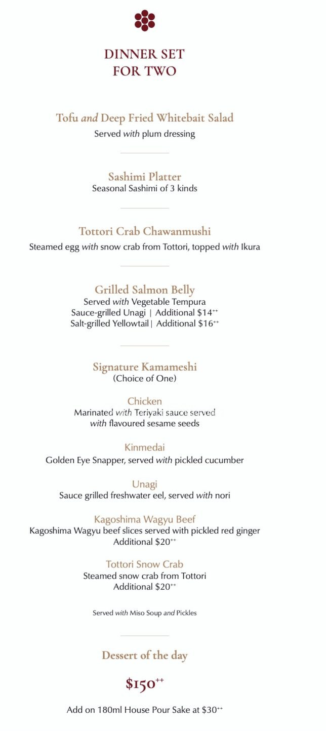 Hanare by Takayama dinner for two that costs $150++ seemed like good value for money. Six courses, including sashimi and their famous kamameshi rice.