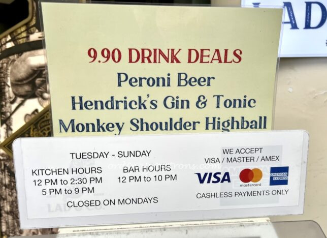 Here is a picture of the drinks menu. Happy Hour is from 12pm to 9pm, which sounds like a whole Happy Day. The HH price of $9.90 for a pint of Peroni beer seemed inevitable.