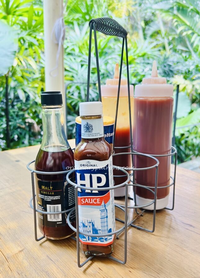 This bunch of sauces is all you need to spice up the fried fish and potato chips. Tomato ketchup, chilli sauce, HP sauce, Heinz malt vinegar can be added. For each order of fish & chips, another two types of condiments are available from a range of four. We picked mushy peas and curry sauce.