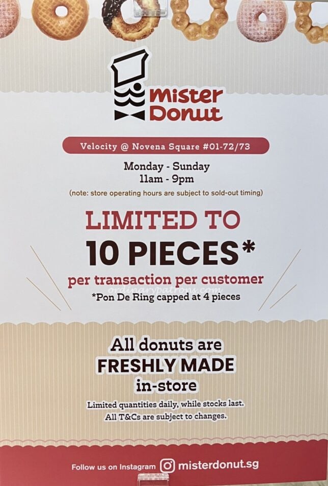 Here are pictures of the donut menu. The Mr Donut Pon De Ring seems to be the most popular type of donut in Singapore. There is a notice restricting purchases to 10 pieces per transaction per customer. This is further restricted, in the case of the Pon De Ring to only 4 pieces. I think this makes us want to try it even more.