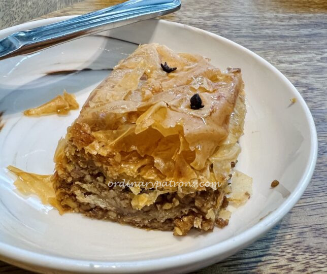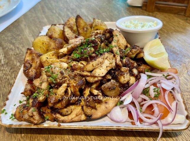 Our final dish was also the most substantial – kalamaki merida. This grilled meat dish came with different options for the type of meat. We chose chicken tiros ($26.90). This messy looking plate contained a pile of grilled chicken on a base of pita bread and baked potato, onions and tomato on the side. Eaten with just a squeeze of lemon or with the yogurt dip, it ensured that we did not go home hungry.