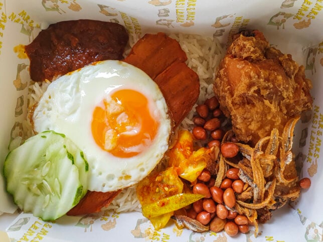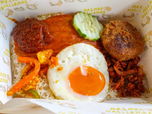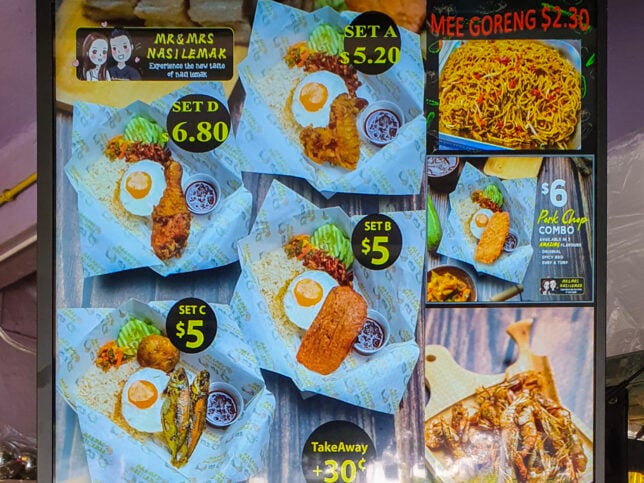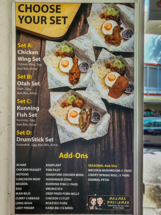 Mr & Mrs Nasi Lemak sells nasi lemak in standard sets. Each set comes with a main item plus egg, achar and ikan bilis. Prices range from $5 to $6.80. There is a long list of add-ons so you can customise your sets. They also offer mee goreng, in case you want nasi lemak without nasi.