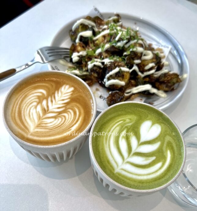 Here are pictures of the online menu. The food items are mostly sandos and pasta with a few side dishes. We decided on a Tamago Sando ($14), Chicken Tatsu Sando ($16), Crispy Brussels Sprouts ($14), Matcha Latte ($6) and White Coffee ($5.5)