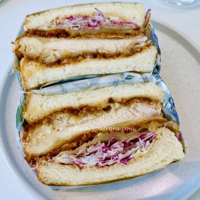 Our two sandos were more predictable. The chicken katsu sando had slices of fried chicken and cabbage between the bread. With a thickness of about 1 cm, the chicken felt substantial yet was light enough to be eaten easily as part of the sandwich.