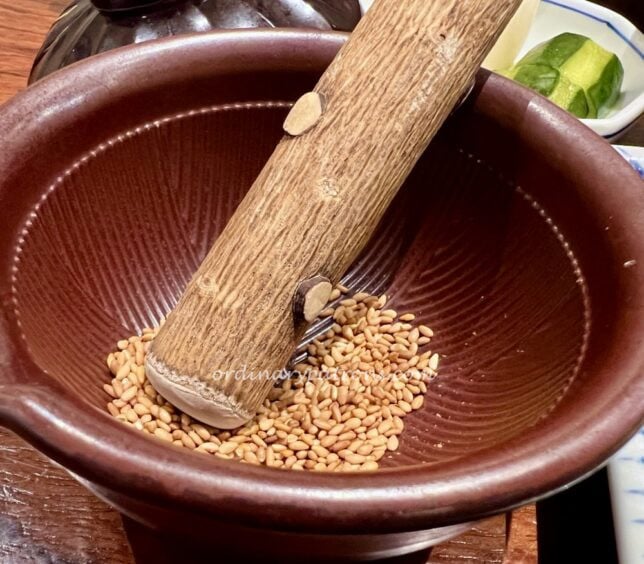 This is a picture of the Ginjo Pork Loin Katsu Set. We found the more pricey Ginjo pork to be more fatty and softer. The dish also included a serving of sesame seeds to be ground and added to the sauce. We thought that the difference between the Ginjo and the regular pork was not that great, although we like the extra taste of ground sesame seeds.