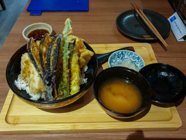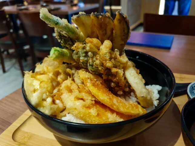 The Vegetable Tendon was the better dish. A bowl of rice topped with a variety of battered and deep-fried vegetables was served on a tray along with pickles and miso soup. The vegetable tempura included broccoli asparagus, long beans mushrooms and pumpkin. There was also an egg. The tempura had a light, crispy texture. On the whole it was an enjoyable tendon.