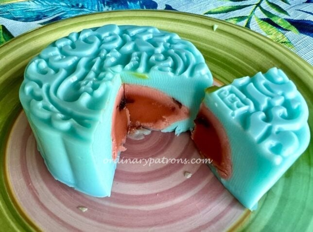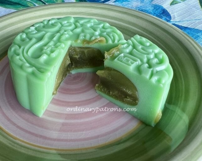 When it was time to eat them, the insides of the mooncakes looked surprisingly similar to regular mooncakes. Instead of a salted egg core in the middle, the agar agar ones have a core which corresponds to the flavour. The raspberry one has a raspberry filling core. We liked both but preferred the matcha one as the matcha taste was robust. The matcha core also has a nice ‘sandy’ texture that made it feel like that of a salted egg yolk.