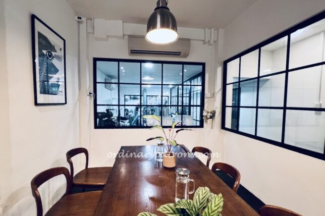A large communal dining table is available at the deep end of the restaurant. From here, one can have a view of the coffee roasting facilities at the back.