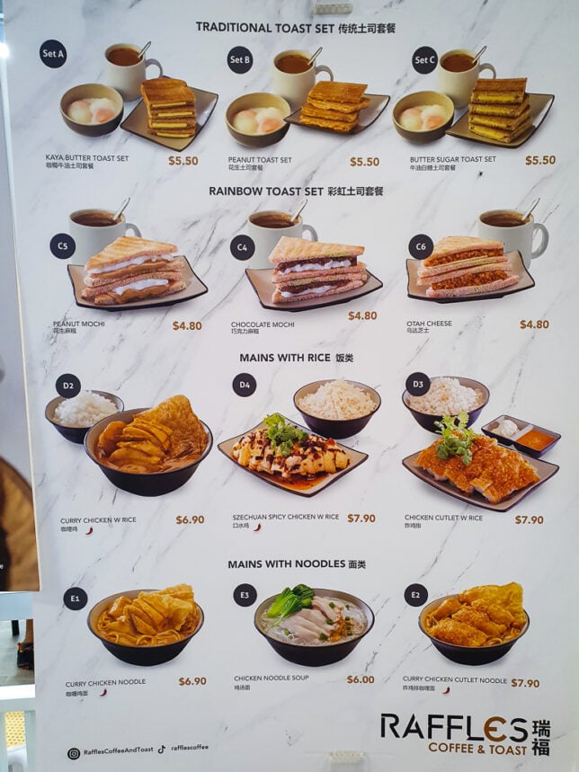 Catering to local kopi lovers, Raffles Coffee and Toast offers the traditional egg & toast set plus a variety of affordable local dishes. You can also get the famous Sing Swee Kee chicken rice there.