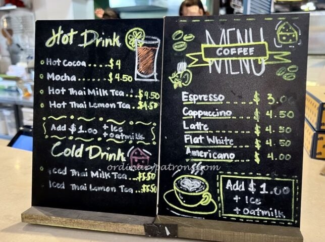 Interesting cakes are available at The Homme Baker @ Margaret Market. According to its website, it is helmed by Bangkok-born pastry chef Pond Lim, who majored in culinary arts at a university in Thailand. We also noticed its impressive Google review score of 4.5. Here is a picture of the drinks options to go with your cake.