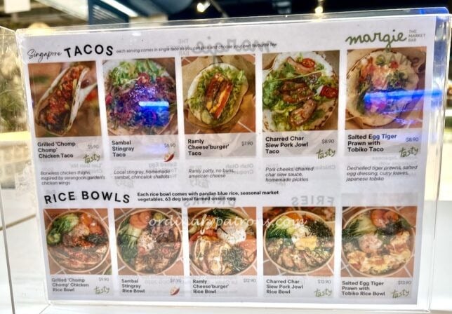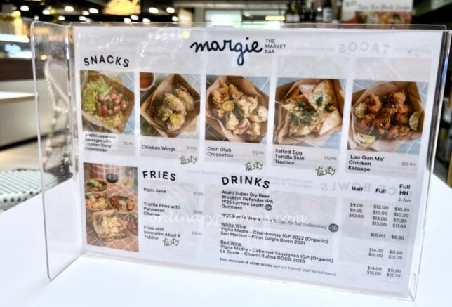Here are pictures of the food menu at Margie the Market Bar at Margaret Market. Tacos, rice bowls and pub food are available.