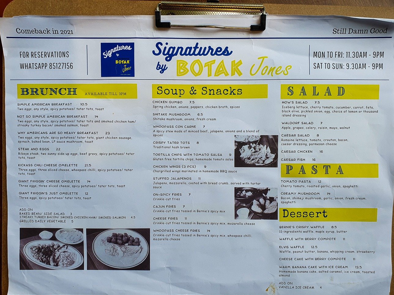 On its menu are items such as Botak Burger, B-B-Q Chicken, Chicken Dawg, Fish and Chips as well as steak and salad. Brunch sets, soups and desserts are also available.