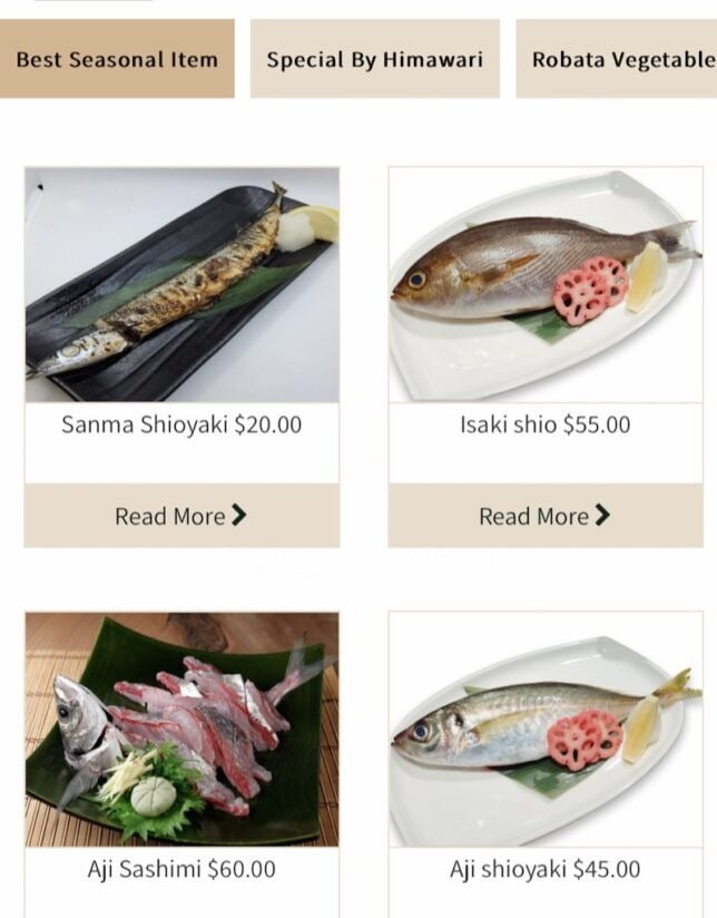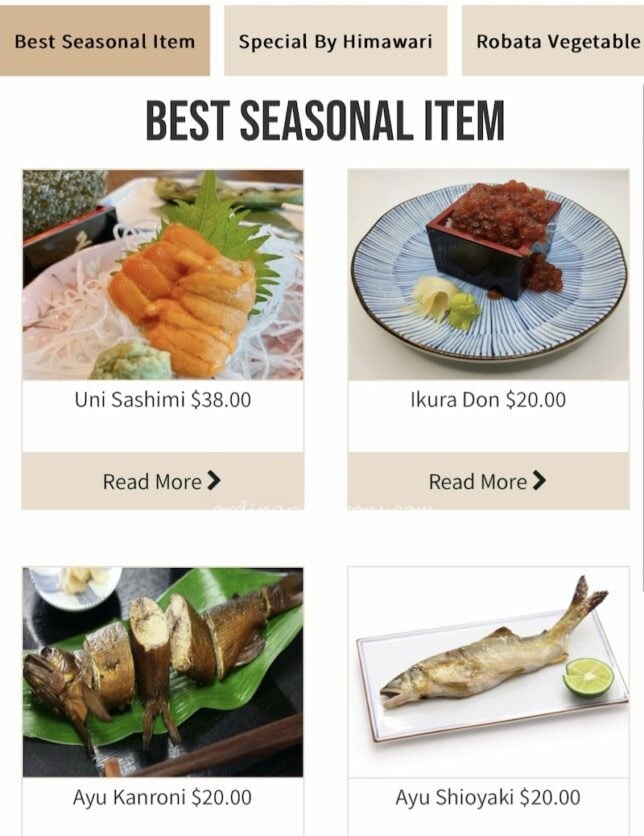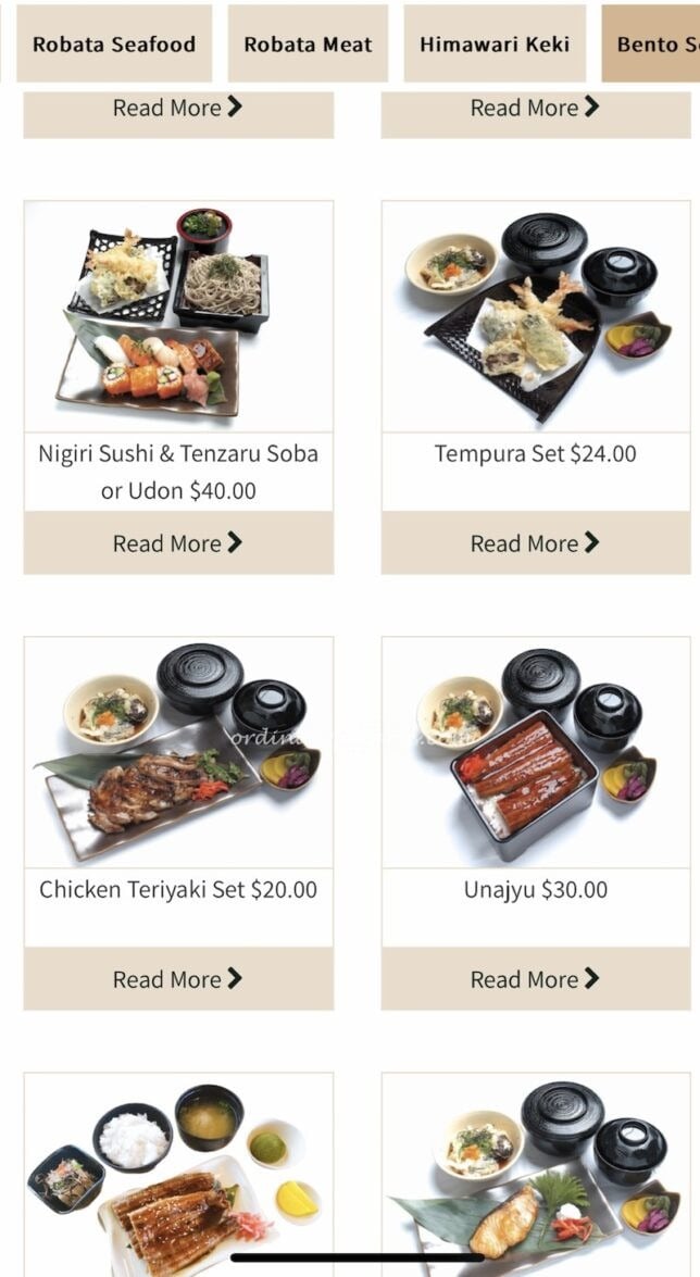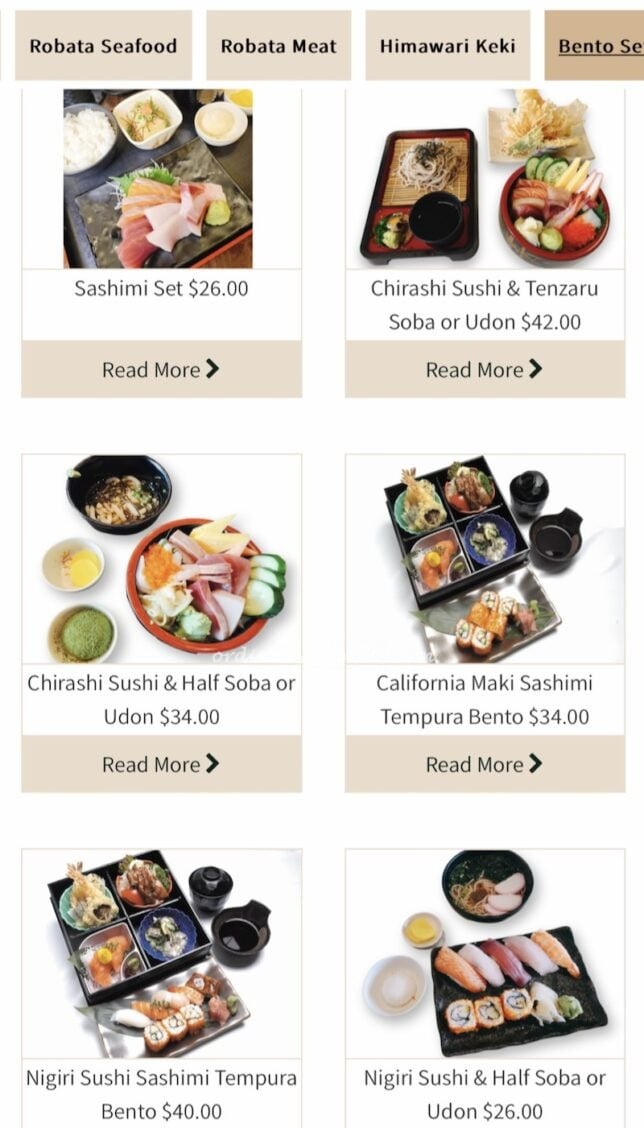 This restaurant reminds me of another Japanese restaurant in the west – Fish Mart Sakuraya in West Coast Plaza. Both are restaurants with a full range of Japanese cuisine on the menu. Sushi, tempura, unagi, cooked dishes of various types are available. Here are some sample screen shots of the Himawari online food menu, showing some of the seasonal items, set lunch and bento selections.