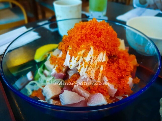 The Sashimi Salad is a dish that is suitable for those on a diet. It contains a mix of small pieces of sashimi, crab meat, prawns, tomatoes, fish roe, cucumber with assorted greens. Our friend on a diet seemed content with her choice that day.