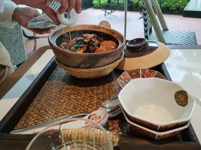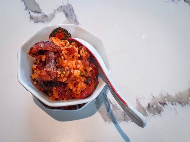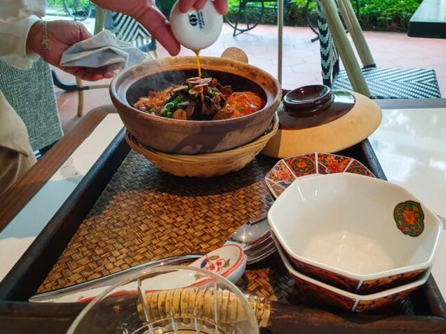 A claypot with the sizzle, smoke and scent was brought to the table on a tray. The server would drizzle sauce over the rice and mix up the rice and various ingredients in the claypot. She would then scoop the rice into two small bowls and serve them to us.