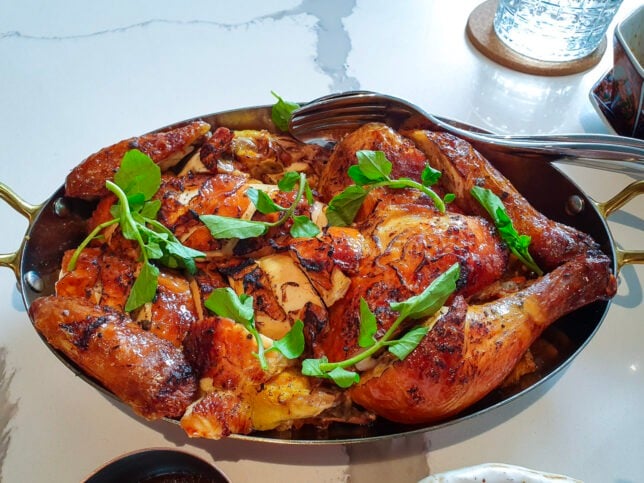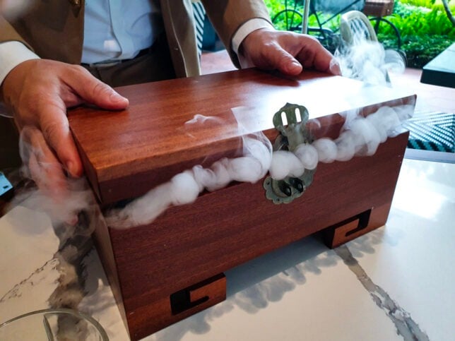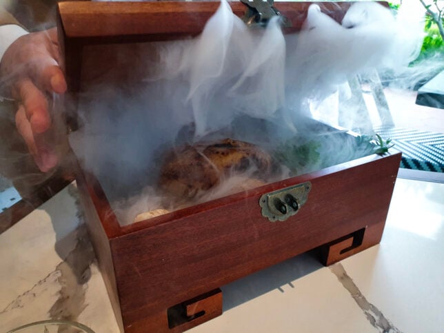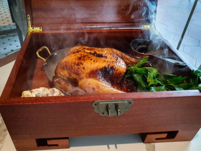 When a wooden box was brought to our table we did not think that our main dish was been served. We were surprised by the dramatic presentation of a whole chicken in the wooden box that was filled with smoke.