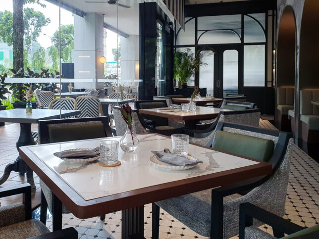 The main dining hall has high bar tables and regular dining tables. There are charming alcove seats towards the rear for those who want a bit of privacy. The new restaurant and bar at Robertson Quay also has an al fresco dining section.