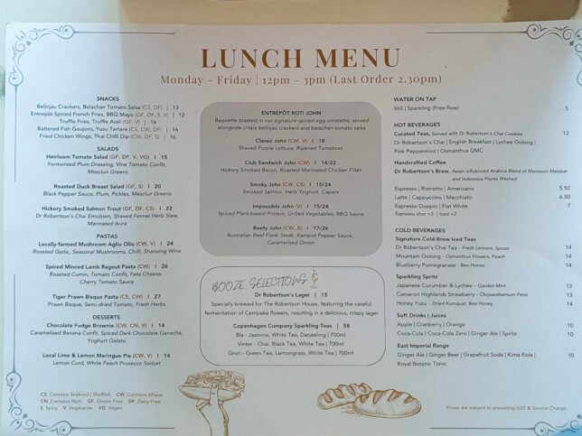 On weekdays, there is a lunch menu offering items such as Roti John and Pastas as well as salads and snacks.
