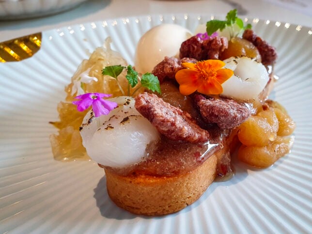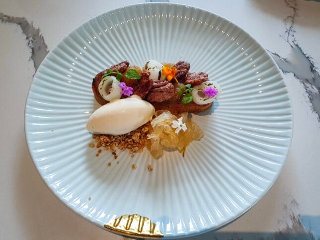 The dessert dish looked pretty. The pecan tart was topped with longan and candied pecan and accompanied by white fungus and vanilla ice cream. Apparently the ingredients were a nod to the local cheng tng. We did not realise that until we were told later but we enjoyed the rich and delicious tart.