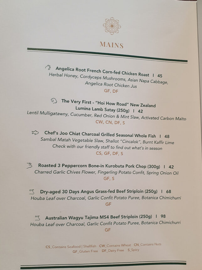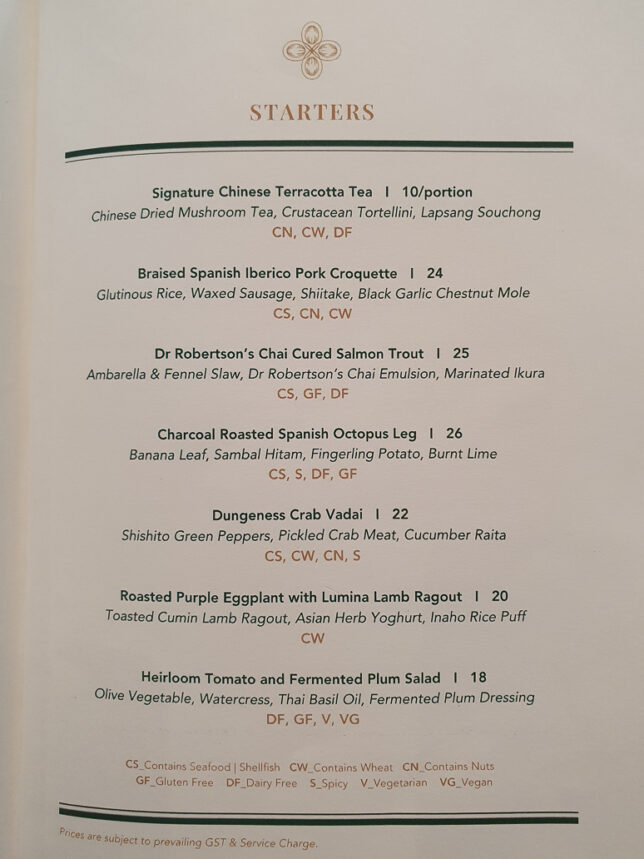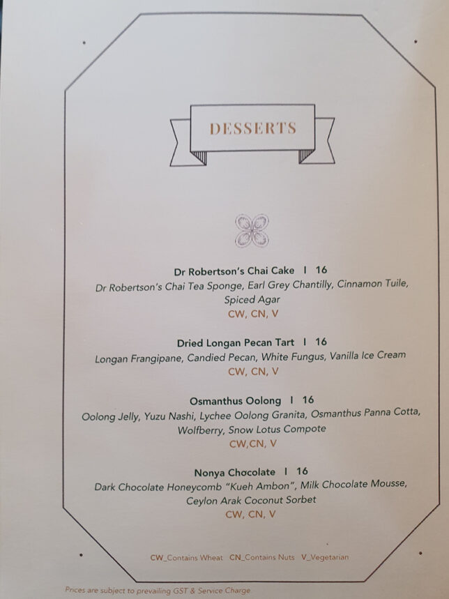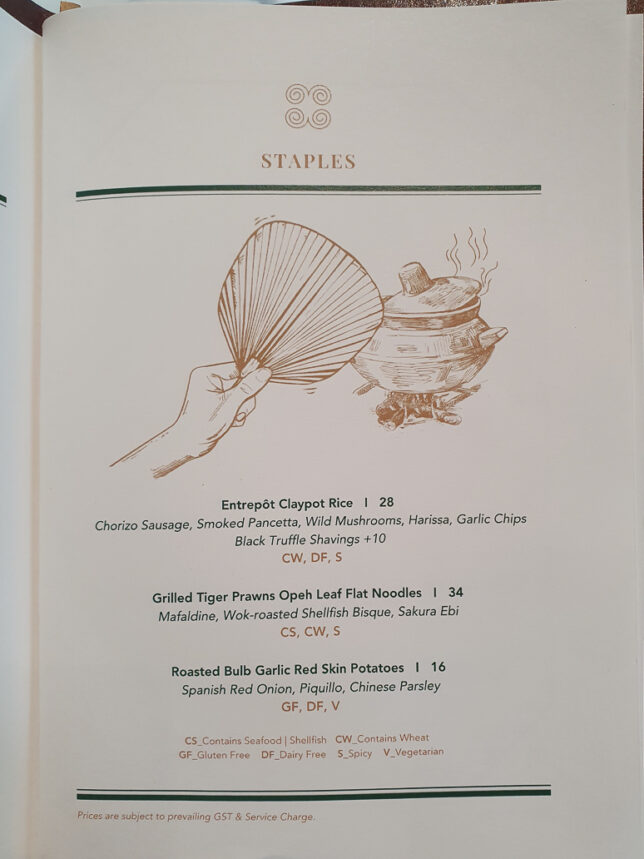 Chef Nixon Low describes the food at Entrepôt Restaurant as “a celebration of the bold and vibrant flavours of Asian cuisine combined with the sophisticated techniques of European cooking, all served in a communal and modern way“. The a la carte menu essentially offers fusion sharing plates. Signature dishes include the Chinese Terracotta Tea, a Chinese dried mushroom consommé served with crustacean tortellini in clay pots: Angelica Root French Corn-fed Chicken Roast; and Dr Robertson’s Chai Cake. Below are pictures of pages from the a la carte menu.