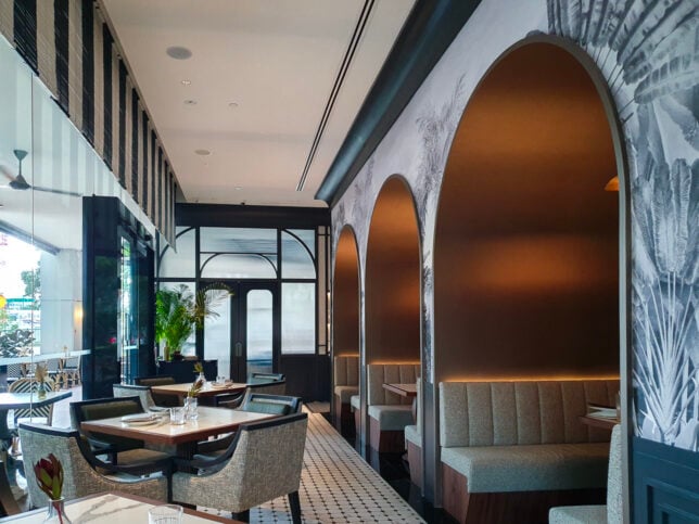 Entrepôt is the all-day dining restaurant and bar located on the ground level of The Robertson House. It has a black and white theme with rattan and dark wood elements. The look and feel could be said to be similar to that of the Long Bar at the grand old dame of Singapore – The Raffles Hotel.