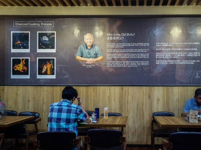 老师父火炭粥 Old Shifu Charcoal Porridge in Tiong Bahru is a small restaurant serving traditional charcoal-brewed porridge and other cheap and good food in air-conditioned comfort.