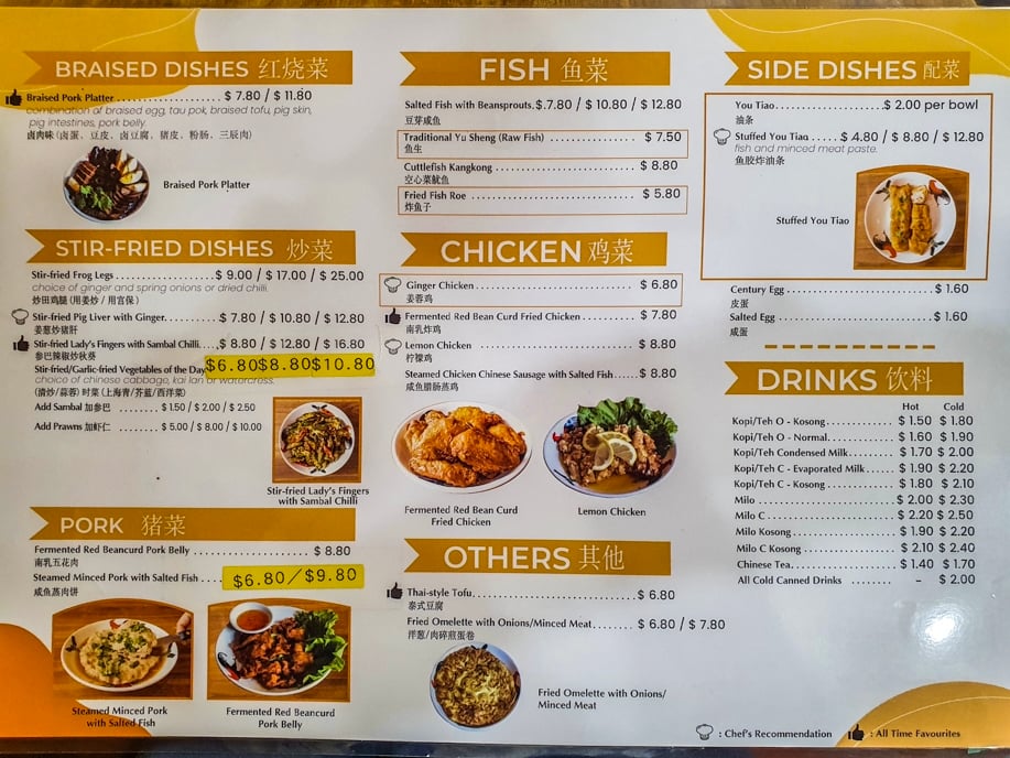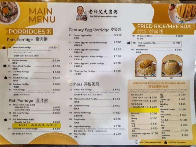The menu of Old Shifu Charcoal Porridge naturally features porridge cooked over a charcoal stove. The are many variety of porridge – minced pork, pig’s liver, fish, century egg, cuttlefish, frog, watercress vegetable and more. The ingredients can be combined in numerous permutations. Besides porridges, fried rice and mee sua are also on the menu. In addition, there are affordably priced zhi char dishes such as ginger chicken, stir-fried frog legs and salted fish with beansprouts.