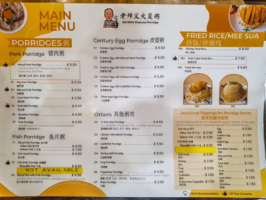 The next time you want porridge in Tiong Bahru you can head to the old school Ah Chiang or to air-conditioned Old Shifu Charcoal Porridge. You will get good comfort food at both places. At Old Shifu Charcoal Porridge, there are also options for those in your party who may not want porridge for that day. Old Shifu Charcoal Porridge is a comfortable place in Tiong Bahru for good food that warms your heart and fills your belly.