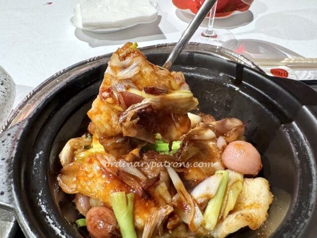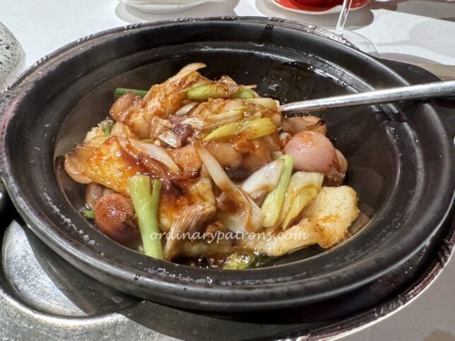 The best dish of the day was the sautéed cod fillet with yellow paste and onions served in a claypot ($78). The fish was presented in thin slices, carefully cooked till they were at their peak. The supporting cast of garnishes and yellow paste made it all taste wonderful. A pricey dish, but one we will order again, to be eaten with plain rice.