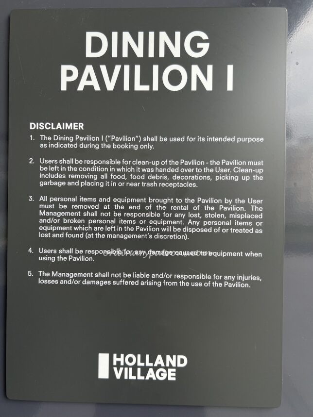 We saw 2 dining pavilions which seem to be available for booking. We do not know whether this will be available for booking by the public or only the residences of the new condo – One Holland Village Residences (currently under construction).
